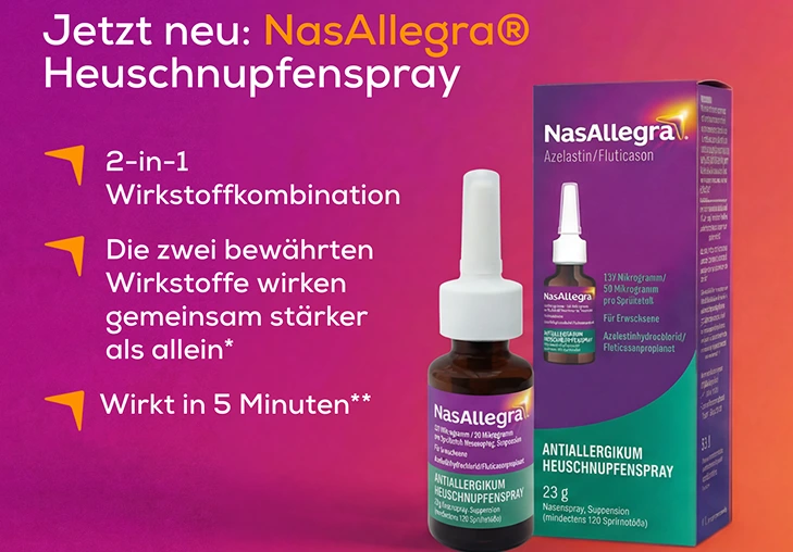 Das Besondere an NasAllegra®? Es enthält die erste 2-in-1 Wirkstoffkombination aus Antihistaminikum und Glukokortikoid gegen Heuschnupfen, die rezeptfrei in der Apotheke erhältlich ist. Es vereint zwei bewährte Wirkstoffe gegen Allergien: Azelastin und Fluticason - gemeinsam wirken sie schnell und stärker als allein und helfen dir so noch besser deinen Heuschnupfen in den Griff zu bekommen.