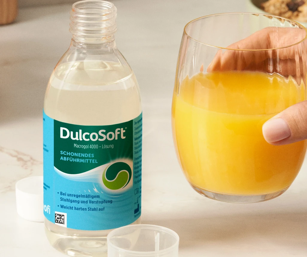 Osmotische Abführmittel oder Stuhlweichmacher, zu denen auch die Produkte von DulcoSoft® (Macrogol) gehören, unterstützen den Körper beim Stuhlgang, indem sie die Flüssigkeitsaufnahme im Dickdarm reduzieren. Diese Präparate enthalten Substanzen (z.B. Macrogol), die Flüssigkeit im Dickdarm binden. Auf diese Weise wird der Flüssigkeitsgehalt des Stuhls erhöht. Sie weichen den Stuhl im Darm auf, sodass der Stuhlgang leichter und angenehmer wird. Diese Abführmittel sind, wenn sie bestimmungsgemäß angewendet werden, eine sichere, sanfte Methode, den Darm in Schwung zu bringen, um wieder leichten und regelmäßigen Stuhlgang zu erreichen.