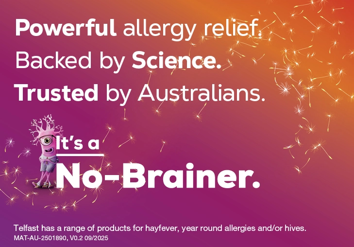 *Telfast® has a range of products for Adults and children aged 12 years and older- hayfever (60mg, 120mg, 180mg), year-round allergies (60mg), urticaria (180mg); Children from 6 months of age- urticaria (Oral liquid); Children from 2 years of age- year-round allergies (Oral liquid)