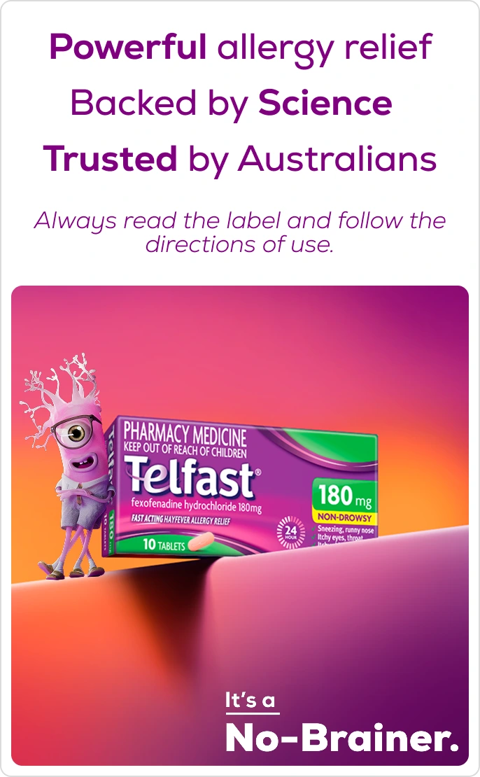 *Telfast® has a range of products for Adults and children aged 12 years and older- hayfever (60mg, 120mg, 180mg), year-round allergies (60mg), urticaria (180mg); Children from 6 months of age- urticaria (Oral liquid); Children from 2 years of age- year-round allergies (Oral liquid)